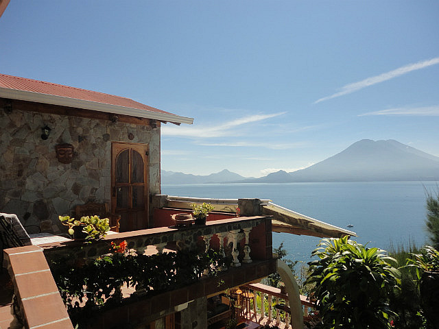 The curvy Inter-American Highway carried us down the mountainside that lead to the first fabulous view of Lago de Atitlan. A deep blue lake set in a crater with peeking mountains around the edge and a view of five volcanoes of various sizes in the distance. Driving through the narrow streets of Panajachel, the primary tourist village and jump off point to other villages around Lago de Atitlan, we were dropped off at Calle del Embarcadero. A few touts promoting their lancha services crowded the bus but as we had all the time in the world, we opted to have breakfast in a small little cafe on the side of the road. Boasting a selection of croissants and doughnuts in a small glass cabinet, we were beckoned in by a lovely lady wearing a little white frilly apron and holding a squeaky little voice. After some pastels and a home made cappuccino, we approached the wooden pier and were ushered on to the next lancha leaving for Jaibalito. Casa del Mundo was the accommodation of choice for the next three nights. Recommended by Lonely Planet and voted top two on Trip Advisor, this place was not going to disappoint.