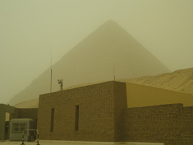 Our first glimpse of the Great Pyramid is that of a giant, (certainly well beyond my expectations of size), orange shadow. There’s two more pyramids in there behind it somewhere but they’re hidden from view by the curtains of dust. We step outside the van and even the air is cold at the absence of the sun. Grit gets in your every exposed orifice and powders your hair in a fine coating making it feel like straw or a horse-tail.